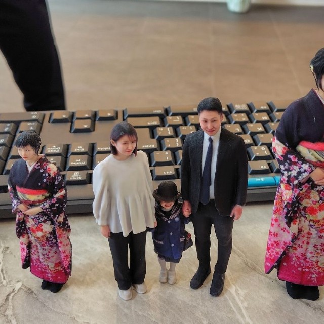 JR六甲道駅から徒歩で1分、「3DME」の店舗兼スタジオ内に足を踏み入れると、壁に設営された棚の上に展示されている大小さまざまなフィギュアが目に飛び込んでくる。晴れ着姿の女性、椅子に腰かけてノートパソコンを打つ女性、デニムを着た猫、哺乳瓶をくわえた赤ん坊など、いろいろなシチュエーションのフィギュアが並ぶ。その中で、子どもを連れた親子3人のフィギュアは、毛受さんのご家族だ。