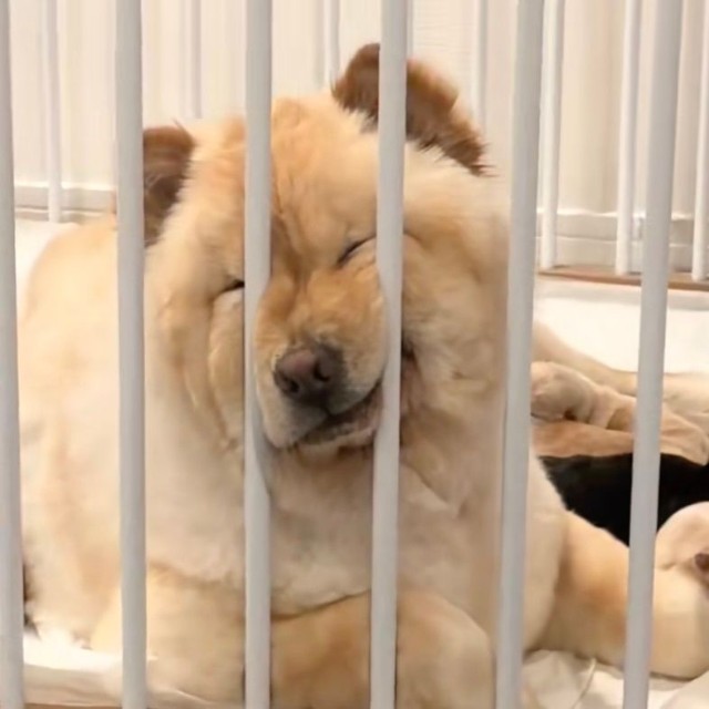 ケージの柵に顔を押し当てながら、「もう好きにして」と言うかのようなブーちゃんは、まるで“大仏”のように穏やかながらも無心の表情です。そんなブーちゃんに、飼い主のパパは「ブーちゃんもう疲れたの?」と微笑みながら声をかけますが、ブーちゃんは無反応…!