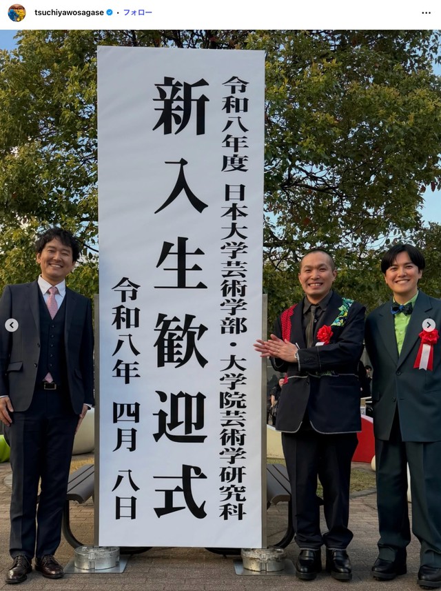 「笑顔がピカピカ」47歳の大学生・ナイツ土屋さん、新入生歓迎式で年下の“先輩”コンビと記念撮影 学科名も明かす