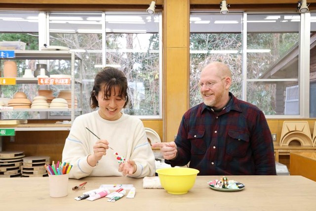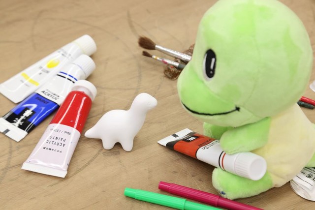 緑豊かな森の中で創作ができる「金津創作の森 創作工房」(あわら市)では、気軽にできる陶芸や竹細工の体験教室を開催。なかでも人気は「カラフル恐竜絵付け体験」。コロンと丸いフォルムがかわいい、ティラノサウルスやプテラノドンなど10種の恐竜を模した白地の小さな置物から、好きな一体を選び、絵の具やマーカーなどで自由に絵付けできます。