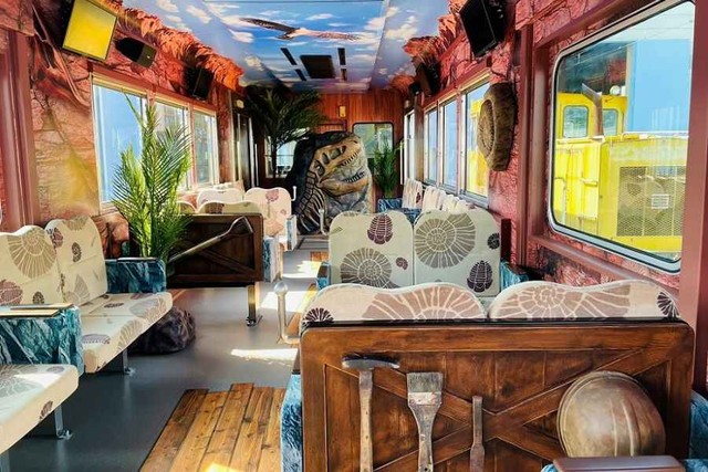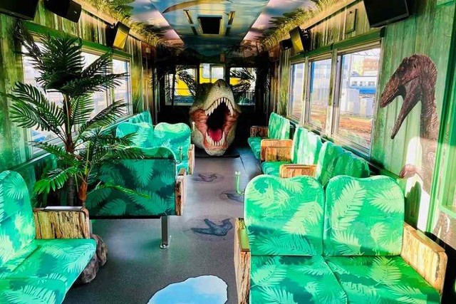 二両編成の車体には恐竜が描かれ、車内は恐竜が生きていた時代のジャングルをイメージした「ジュラシックゾーン」、まるで化石の発掘現場にいるような「化石発掘ゾーン」からなり、探検隊に扮した乗務員がおもてなし。乗車中は、恐竜クイズや恐竜博物館の案内もあり、博物館へと向かうワクワク感をさらに高めてくれます。土日祝日(冬季を除く)、夏休み中の平日運行。