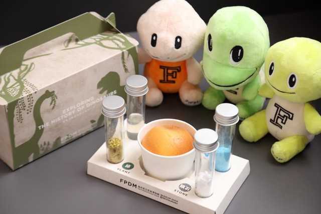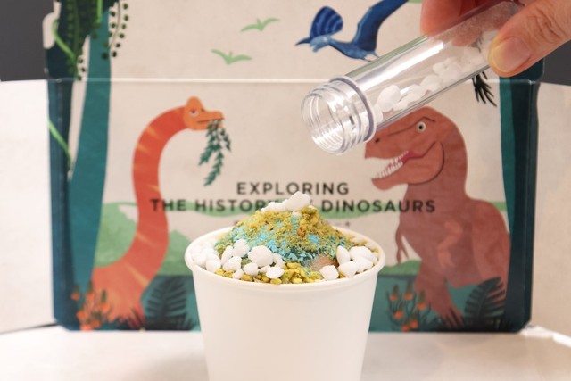 お土産には、地球に見立てた丸いケーキに、試験管に入った水(レモンジュレ)、緑(ピスタチオ)などを順番に振りかけることで、恐竜の歴史を再現する「恐竜の歴史をたどるケーキ」(お持ち帰りBOX)1800円も人気です。