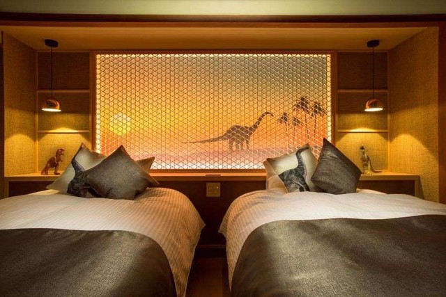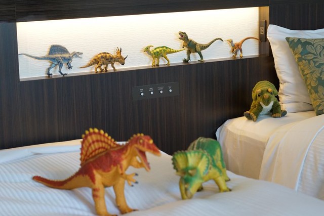 例えば、最上階の天空大浴場から「水と歴史の都福井」を一望できるシティホテル「リバージュアケボノ」(福井市)には、定員5名の2部屋と、定員3名の10部屋の「恐竜ルーム」がスタンバイ。部屋のあちこちに恐竜が待ち構え、家族や仲間で楽しめる恐竜パズル・絵本・ゲームも用意されています。開けてビックリな「恐竜の卵」の中身はプレゼント。