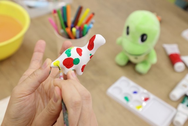 完成品は当日持ち帰りできる気軽さも人気の理由のひとつ。実際の恐竜がどんな色だったかは、まだわからないので自由な発想で想像力を膨らませながら、創作する楽しさと、自分だけの恐竜ができる喜びを体験してください。流暢な日本語を喋るアメリカ出身のアーロンさんなど、優しい指導員さんのレクチャーのもと体験できるので、お子さんも安心です。